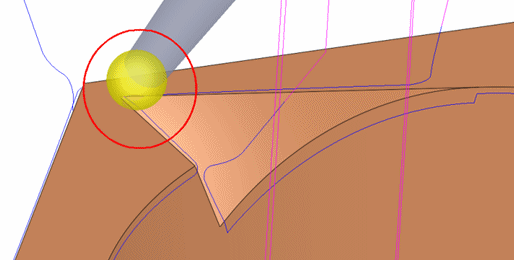 Exit the simulator. Navigate and zoom-in to the inner corner as shown below. At the corner, the tool approaching from the right stopped at a position where the chamfer size on both edges is equal while trimming the motions to the exact corner.