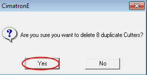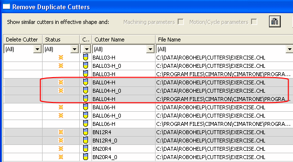 When the dialog opens, all groups of duplicate cutters are displayed and each group of identical cutters is highlighted for clarity in the Cutter Table of the dialog displayed in alternating shaded and unshaded rows.