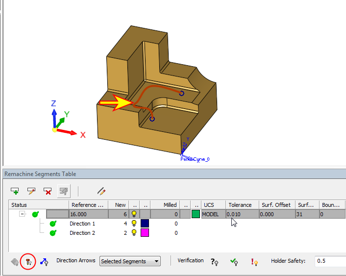 Select the only segments that were found as Gouging. Click on the Show Cutter button.