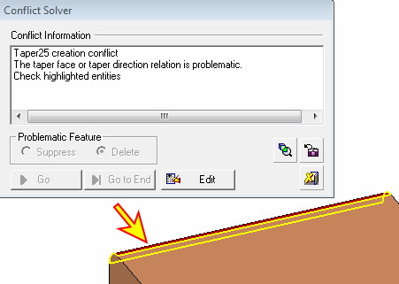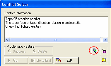 Notice the Conflict Solver. The system indicates the problematic face by highlighting the face in Red. Press the Zoom to Problematic Entity icon to emphasize the missing entity.