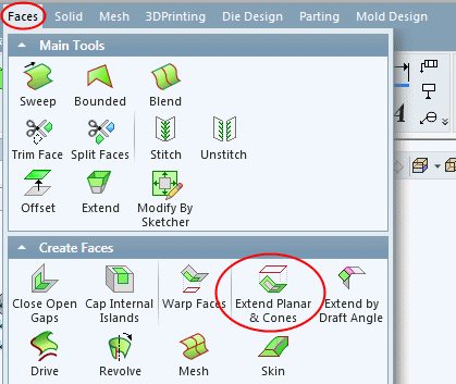 - Change the Don't Extend option to Extend and set the parameters as shown in the picture below. You can also use the Trim option to trim the faces. However, we will use the Trim option later on, separately, to learn this option.