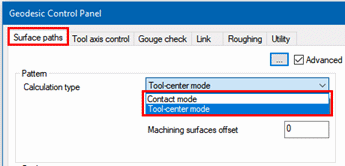 In the Surface paths tab, two Calculation types are available: Contact Mode and Tool Center Mode.