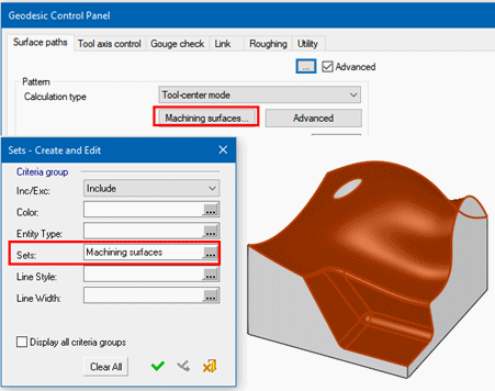 Click the Machining surfaces button and select By Criteria the Set named Machining surfaces.