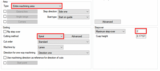 Set the Cutting method as Spiral and the Maximum step-over as 2 mm.