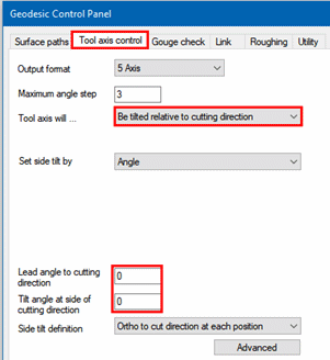 The Tool axis control tab includes many parameters that are familiar from 5X-Production. Set the Tool Axis parameter to Be tilted relative to cutting direction with zero lead and side angles.