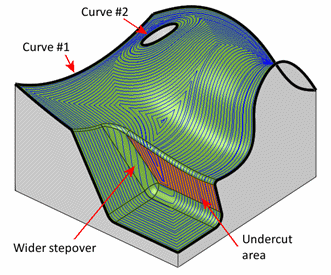 At some areas, the stepover seems to be wider than anywhere else. This is the result of the tool, center mode calculation. The stepover has been calculated on an offset geometry and then projected along the tool orientation onto the real geometry, which is why it looks as if it is not conforming to the set stepover value.