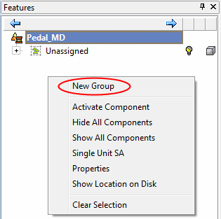 The Main assembly appears in the tree, including the Unassigned group (which currently contains all parts in the assembly). Right-click and select the New Group option.