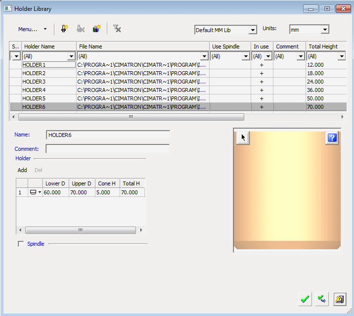 The Holder Library is the companion to the Cutter Library. In terms of functionality, they are very similar. Obviously, there are fewer parameters in the Holder Library since there are no machining or motion tabs.