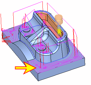 Machining the horizontal layer using rough technology enables you to control the Approach motion. The Approach motions are performed through the air and not through the stock.