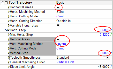 Using the Limit Angle technology, both horizontal or vertical areas (divided by a slope angle) can be milled using different machining technologies.