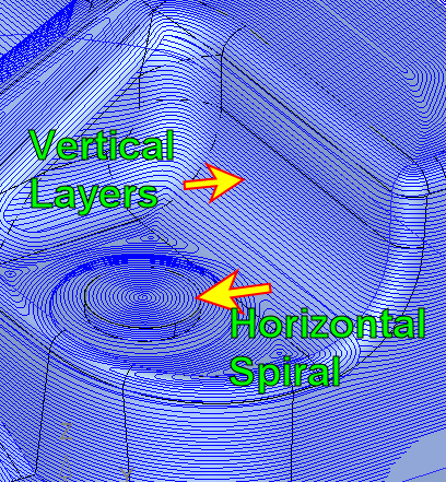Horizontal spiral machining and vertical layer machining can clearly be seen in the previous image.