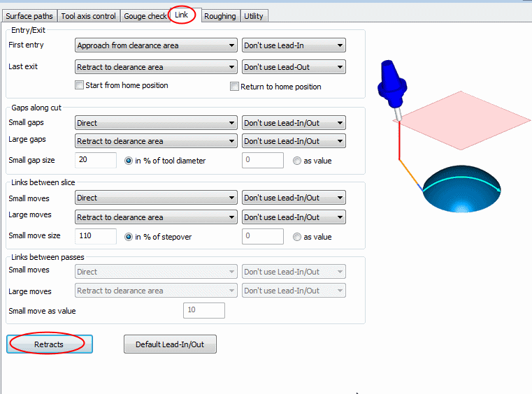 Notice that the created cylindrical motions are performed in a radius of 210 mm and not 120 as defined. The system will calculate the minimal safe distance needed to not gouge any geometry. The search for a new safe height is performed in steps of 10 mm as defined in the Air Move Safety Distance parameter.