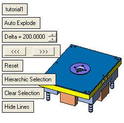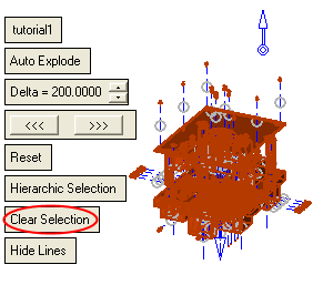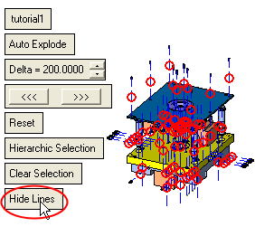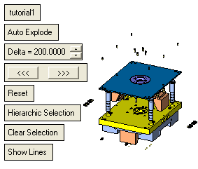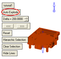 Auto explode: Press this button to perform Automatic Explode view. The distance between the components is determined by the Auto Delta value. Auto Delta: The distance between each component when performing an automatic explode. Reset Selection: Return the selected component to its original position. Hierarchic Selection / Simple Selection: When only the parent is selected, the system automatically selects (hierarchic selection) the children as well. (It does not automatically select the children if Simple Selection is chosen.) Hide/Show Lines: Hide/Show the explode lines that connect between parts. |
