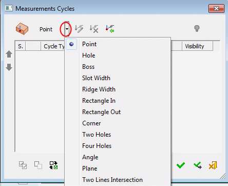 Click the dropdown arrow to display all available measurement cycles. These are the same cycles that are available in the In-Process Measurement dialog. Some machines support more cycle types and others do not support all the ones the procedure offers. These are the ones that are the most commonly used.
