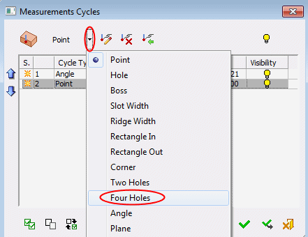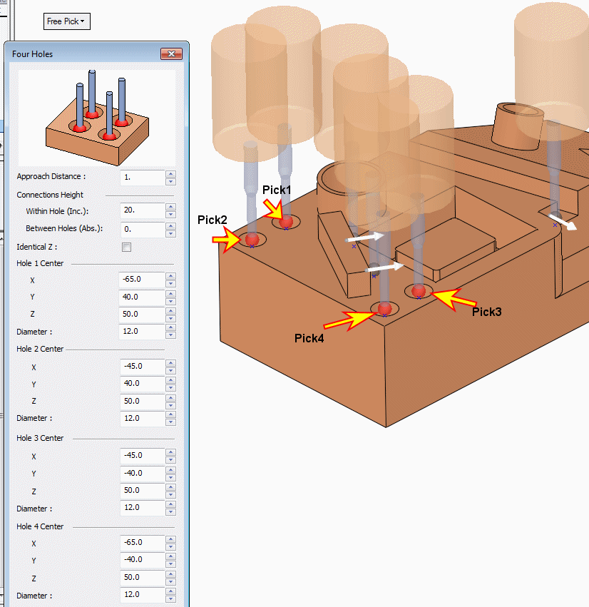 Once the Four Holes dialog opens, pick the cylindrical edge centercenter of each hole as shown below.