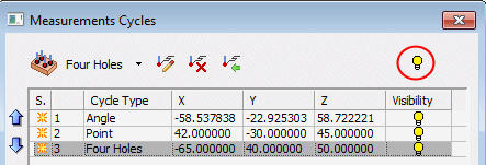 The 3 controls3 controls at the top of the dialog enable the following (left to right): Edit Cycle, Delete Cycles, and Import from CMM file. The CMM file is the one that was pre-defined by the CAD engineers.