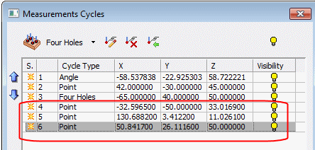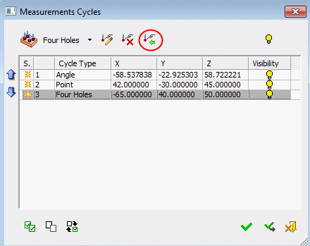 Notice the three Point measurement rows that were added to the Measurements Cycles list. The XML file contained data of 3 measured points. Each was added as a separate cycle.
