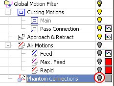 Phantom Connections control the display of motions between procedures and the display of 5-axis connections between drill locations by marking them as phantom.