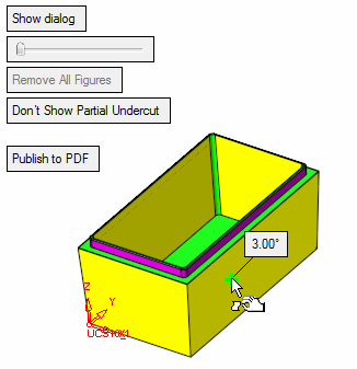 To display the local draft angle at any point on a face, move the cursor over the appropriate face as indicated by the arrow shown in the image below: