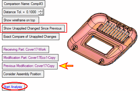 The system automatically suggests the Previous to be the copied master file (see the Previous Modification parameter indicated by the arrow). In this way, the analysis will exclude all differences between the Receiving part (the work part in this case) and the previous modification part (the Master in this case). So the mending job will be excluded from the compare operation and will be kept as it is in the work file.