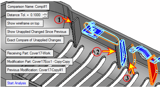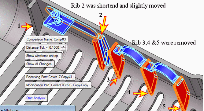 Although Ribs 2 & 3 do belong to the group of faces that were changed due to the ECO changes, they were not recognized as such and were not marked in RED. The reason for this behavior, as explained in the beginning of the exercise, is because the system could not find the exact faces in the work file as they were changed as part of the mending job.