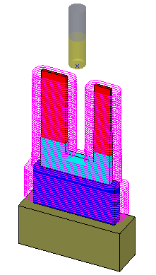 Only one offset is defined. The toolpath follows the given geometry (RED, LIGHT BLUE, and BLUE surfaces).