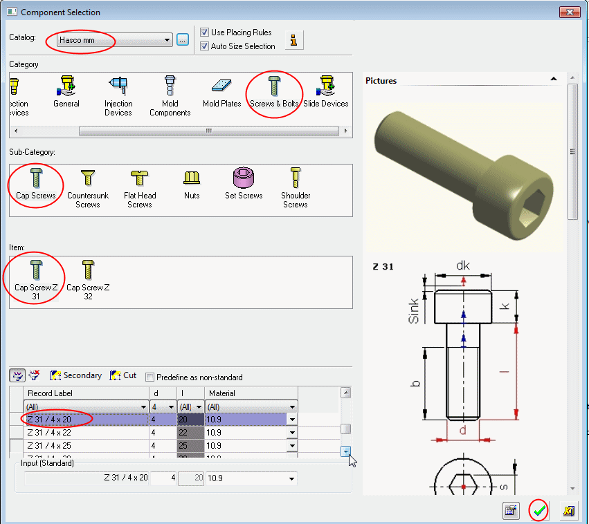 From the catalog list, select the Z31 / 4 x 20 Cap Screw and click OK.