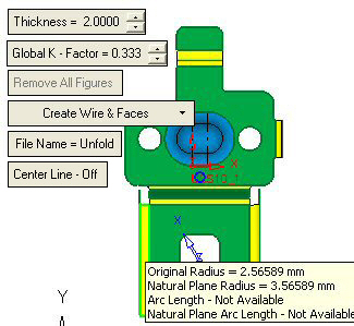 The cylindrical faces are colored in YELLOW. Move the mouse over these faces. The information regarding the Original Radius and the Natural Plane Radius is displayed as follows: