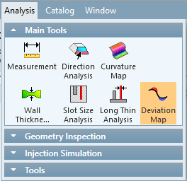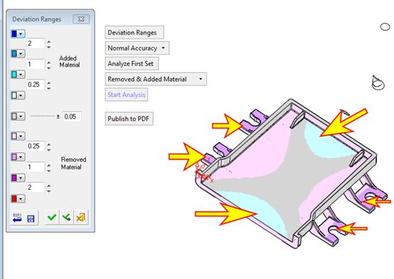 Deviation Map can be used to find out how much material has been added or removed between two versions of a part. Prior to using the Deviation Map, overlay the new part on the old one by either adding it to the assembly or importing it. The results of the analysis are presented using a color-coded display. A mouse click in a specific area will display the distance between walls and other features.