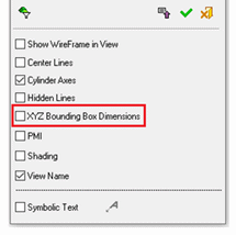 The 3 bounding box dimensions of the part (X,Y,Z) can be added when creating a multi view. The dimensions are normally added on the Top view (if it is created) and one perpendicular view. In the case of revolved parts, the system creates a single diameter dimension instead of the X and Y dimensions. This is especially useful when creating a multi-frame drawing holding multiple parts.