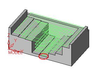 However, due to a Part Surfaces Offset of 0.5, machining does not start here due to a gouge detection and hence starts 15 mm higher (the Fixed Vertical Step).